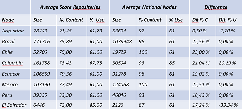 - Para cada país, los puntajes se compararon entre los repositorios y el Nodo Nacional.