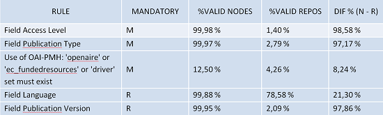 La Tabla 2 muestra las fuertes diferencias en algunos campos claves entre repositorios y los Nodos Nacionales. La tabla completa se puede encontrar aquí.
